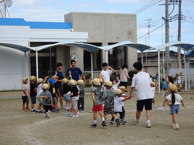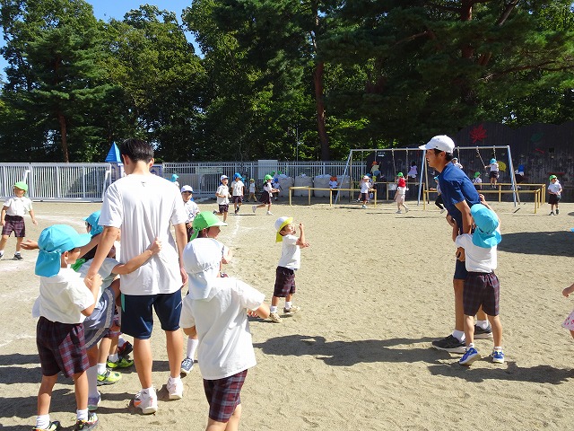 お兄さんたちということで、当然、子どもたちは大喜びです。鬼ごっこをしたり、だるまさんが転んだをしたりして、ずっと走り回って遊んでいます。そして、お兄さんの取り合いが始まります。くっついたり手を繋いだりと、まるで担任の先生や他の先生たちが目に入っていないかのように、お兄さんをめがけて子どもたちが集まります。
