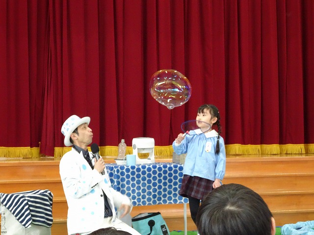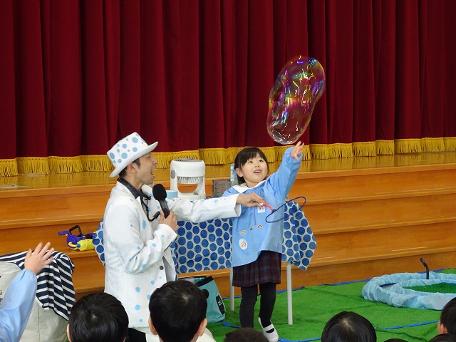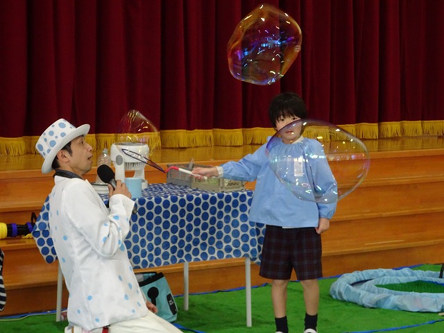 今回のしゃぼん玉ショーは、家庭学級の一環として父母の会の役員の皆様方が企画をしてくださいました。幼稚園と子どもたちのために、本当にありがとうございました。昨日おたよりを配布しましたが、2月には、11月に行うはずだった第二回家庭学級『ミュージカル』鑑賞もあります。ぜひ、興味・関心をお持ちの保護者の方はご参加くださいね。