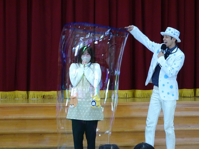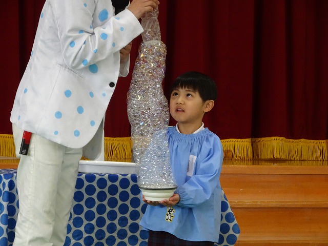 実際に、代表の子どもたちに体験してもらったものもありました。「やってくれるお友だちはいるかな~?」というバブリン先生の言葉に、「はいはいはいはいはいはいはいーーーーーーー!!!」と手をピンと伸ばして立候補しましたが、全員を選ぶことはできなかったので、選ばれた子どもたちは、今日はラッキーでしたね♪代表でありながらも、目をまん丸にして見入っていました。最後には、先生もしゃぼん玉の中に入りましたよ!