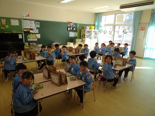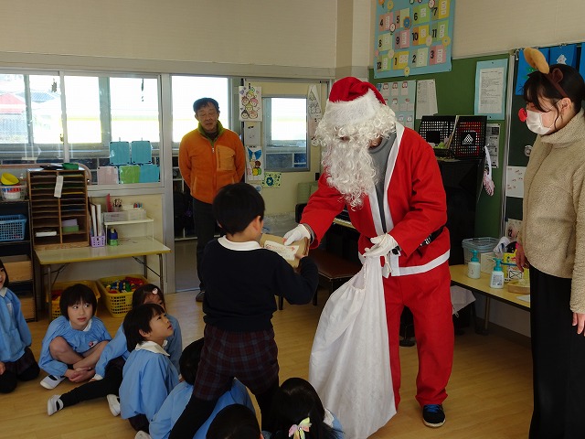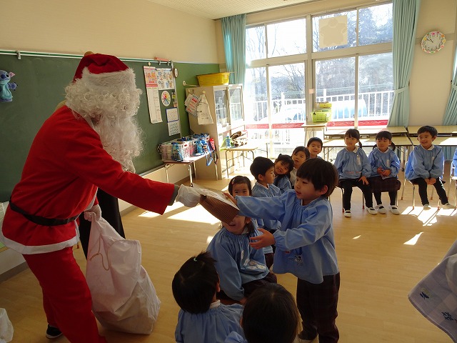 生活発表会が終わり、冬休みまであと少しです。約一か月半、生活発表会に向けて練習を頑張り、当日も素敵な姿を見せてくれた子どもたちにお楽しみを…と幼稚園にサンタさんがやって来てくれました。今日は、西多賀幼稚園でクリスマス会をするとどこかで聞いたのでしょうか。サンタさんは子どもたち全員分のお菓子をプレゼントに持ってきてくれました。急に一人で来たので、真穂先生がトナカイに扮したり、荒先生が鈴を鳴らしてくれたりして一緒にクラスを回りました。サンタさんの登場と、お菓子をもらえたことに大喜びの子どもたちは、もう目が釘付けです。中にはポカン…とした表情の子もいて、それもまた可愛らしかったです。