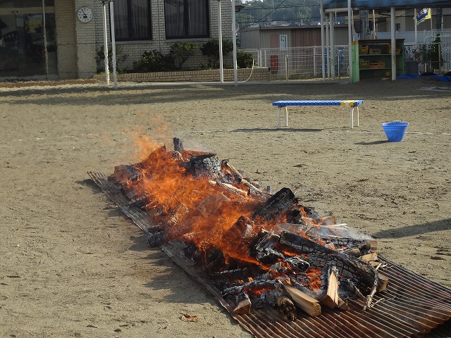 みんながまつぼっくり公園で拾い集めた小枝や、バスの先生たちが薪割り機を使ってコツコツと作り貯めておいてくれた薪に点火!